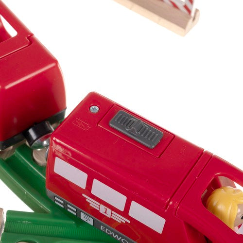 elementi, tostarp sliežu ceļš, pasažieru vilciens, celtniecības vagoni, koki,