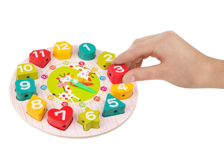 Šis ir koka rotaļlietu pulkstenis, kas bērniem palīdzēs:
