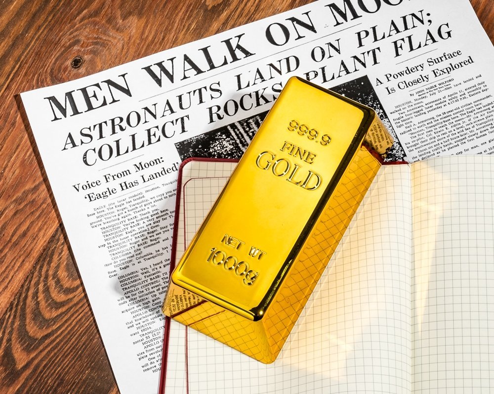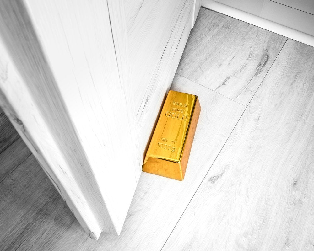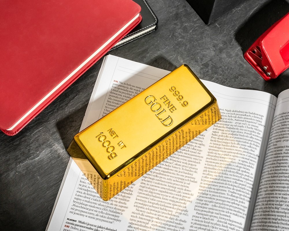 Funkcijas: - perfekta zelta stieņa formas un izskata imitācija - izskatās pēc īsta zelta stieņa - var izmantot kā durvju aizbāzni, papīra svaru vai galda dekoru - cēla unikāla dāvana ne tikai biznesa cilvēkiem - ideāls galda aksesuārs, lai pārsteigtu darba kolēģus! - jauka caurspīdīga kaste - dāretāla svars apm. 650 g