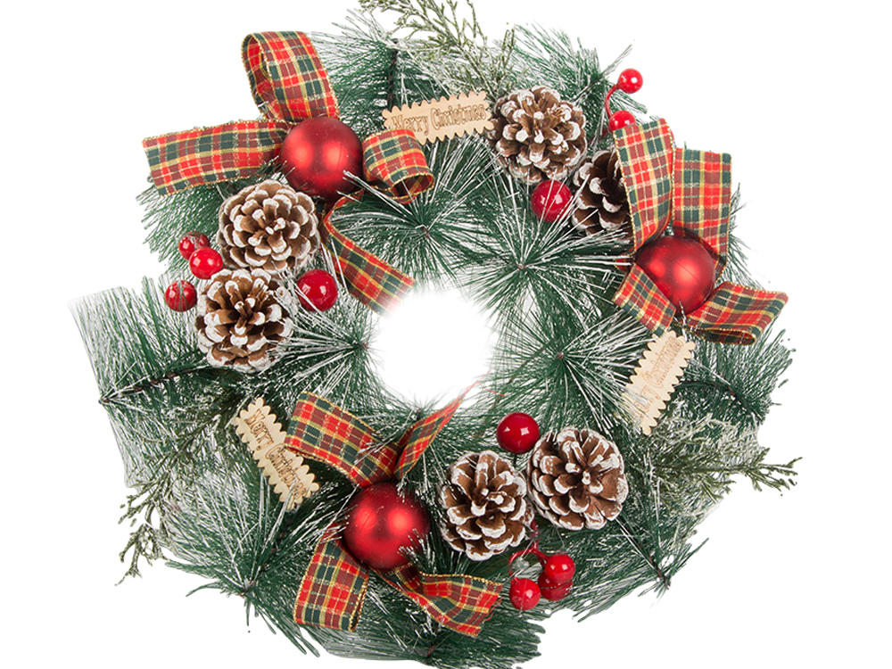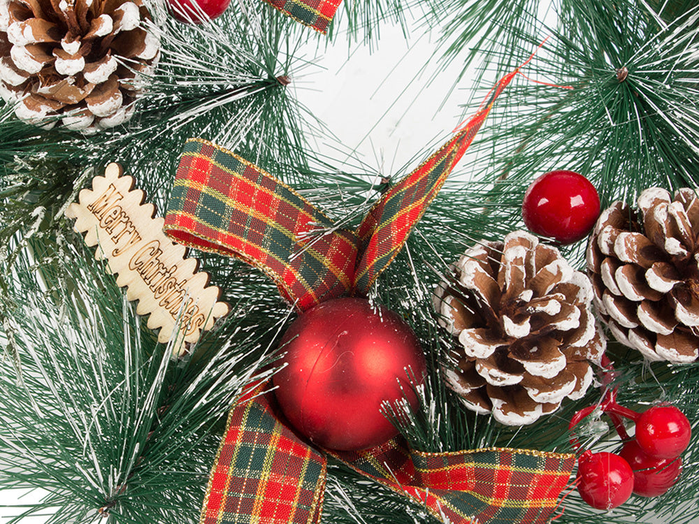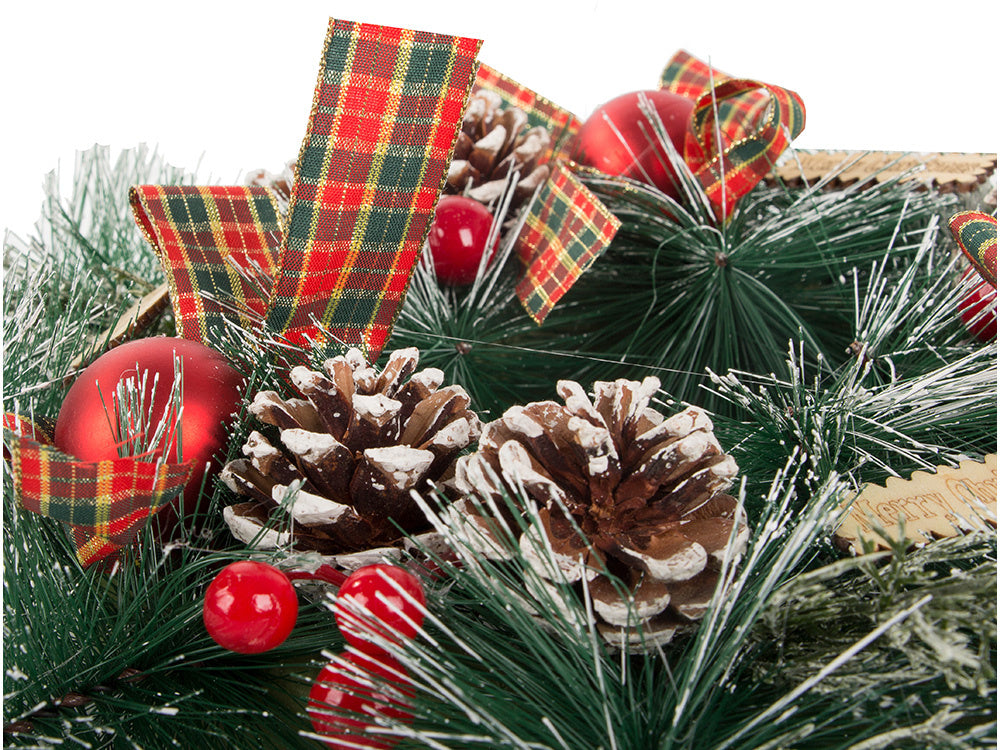 Ziemassvētku dekoratīva vītne sienas dekorācijai, durvju dekorācijai, Ziemassvētku rotājumiem. Meklējat perfektu rotājumu, kas jūsu mājām piešķirs svētku sajūtu? Mūsu Ziemassvētku vainags ar rotājumiem ir unikāls aksesuārs, kas ienesīs Ziemassvētku burvību jebkurā interjerā. Iedvesma, kā skaisti izkārtot Ziemassvētku vainagu ar rotājumiem jūsu mājās: ? ieejas durvis - klasiska vieta Ziemassvētku vainagam ir ieejas durvis - tas rada svētku noskaņu jau no sliekšņa. To var pakārt pie sarkanas, zelta vai sudraba krāsas lentes, saskaņojot krāsas ar pārējiem rotājumiem ārpusē. Lenti var sasiet bantītē, lai iegūtu elegantu pieskārienu. ? ēdamgalda centrālais elements - novietojiet vainagu galda centrā un ievietojiet sveci vai LED laternu iekšpusē. Tas radīs atmosfērisku dekorāciju jūsu Ziemassvētku pusdienām vai vakariņām. Ja jums ir lielāks galds, ap vainagu varat novietot dažus mazus svečturus vai Ziemassvētku figūriņas, radot skaistu kompozīciju. ? kamīna dzega vai plaukts - pakariet vainagu virs kamīna dzegas vai uz plaukta kā centrālu dekoratīvu elementu viesistabā. Vainags lieliski saderēs ar citiem rotājumiem, piemēram, egļu zariem, svecēm, mini rotājumiem vai lampiņām. ? Logs — vainags, kas pakārts logā, rada svētku atmosfēru gan mājā, gan ārpus tās. Varat pievienot nelielas LED lampiņas, lai vakarā radītu maģisku apgaismojumu, kas redzams no ārpuses. ? Kāpnes — vainagu var pakārt gar margām, lai piešķirtu kāpnēm šarmu. Varat izvietot vainagus ik pēc dažiem pakāpieniem un starp tiem izvietot egļu zarus vai pievienot lampiņas, lai pavadītu viesus augšup pa kāpnēm svētku atmosfērā. . Vainags ir izgatavots no augstas kvalitātes priežu zariem (mākslīgiem, reālistiskiem), dekorēts ar dabīgiem čiekuriem, rotājumiem un lentītēm. Tradicionālas Ziemassvētku krāsas. Tehniskās specifikācijas: ? Simbols: ? Ziemassvētku raksti un detaļas ? Ideāls rotājums mājas iekšpusei un ārpusei ? Dabīgi čiekuri ? Viegla konstrukcija ? Ziemassvētku dizains ? Vainaga diametrs: Komplektā ietilpst: ? Ziemassvētku vainags ar rotājumiem ? Folijas iepakojums