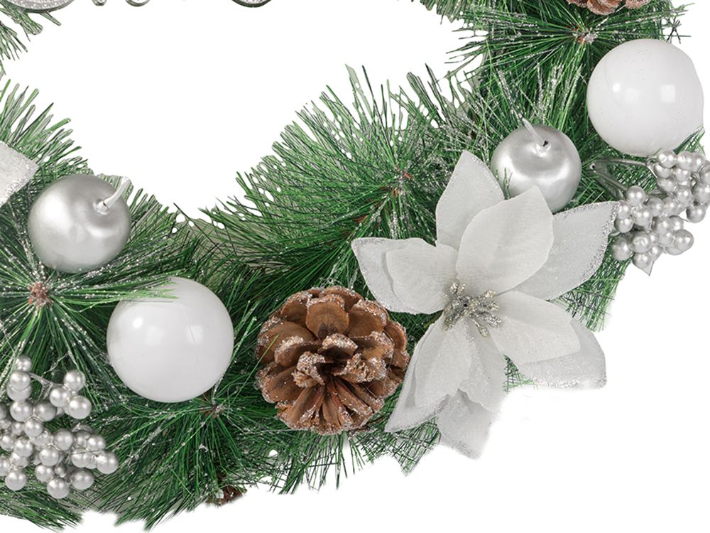 Ziemassvētku vainags durvju dekors sienas dekors Ziemassvētki 40 cm Meklējat perfektu dekoru, kas jūsu mājām piešķirs svētku sajūtu? Mūsu Ziemassvētku vainags ar rotājumiem ir unikāls aksesuārs, kas ienesīs Ziemassvētku burvību jebkurā interjerā. Iedvesma, kā skaisti izkārtot Ziemassvētku vainagu ar rotājumiem jūsu mājās: ? ieejas durvis - klasiska vieta Ziemassvētku vainagam ir ieejas durvis - tas rada svētku noskaņu jau no sliekšņa. To var pakārt pie sarkanas, zelta vai sudraba krāsas lentes, saskaņojot krāsas ar pārējiem rotājumiem ārpusē. Lenti var sasiet bantītē, lai iegūtu elegantu pieskārienu. ? ēdamgalda centrālais elements - novietojiet vainagu galda centrā un ievietojiet sveci vai LED laternu iekšpusē. Tas radīs atmosfērisku dekoru jūsu Ziemassvētku pusdienām vai vakariņām. Ja jums ir lielāks galds, ap vainagu varat novietot dažus mazus svečturus vai Ziemassvētku figūriņas, radot skaistu kompozīciju. ? kamīna dzega vai plaukts - pakariet vainagu virs kamīna dzegas vai plauktā kā centrālu dekoratīvu elementu viesistabā. Vainags lieliski saderēs ar citiem rotājumiem, piemēram, egļu zariem, svecēm, mini rotājumiem vai lampiņām. ? Logs — logā iekārts vainags rada svētku atmosfēru gan mājā, gan ārpus tās. Varat pievienot nelielas LED lampiņas, lai vakarā radītu maģisku apgaismojumu, kas redzams no ārpuses. ? Kāpnes — gar margām var pakārt vainagu, lai kāpnēm piešķirtu šarmu. Varat izvietot vainagus ik pēc dažiem pakāpieniem un starp tiem izvietot egļu zarus vai pievienot lampiņas, lai viesus vadītu augšup pa kāpnēm svētku atmosfērā. . Tehniskās specifikācijas: ? Simbols: ? Ziemassvētku detaļas ? Ideāls rotājums mājas iekšpusei un ārpusei ? Dabīgi čiekuri ? Viegla konstrukcija ? Ziemassvētku dizains ? Vainaga diametrs: Komplektā ietilpst: ? Ziemassvētku vainags ar rotājumiem ? Folijas iepakojums