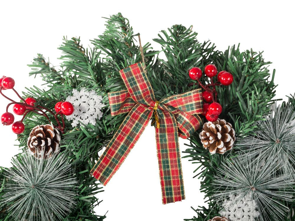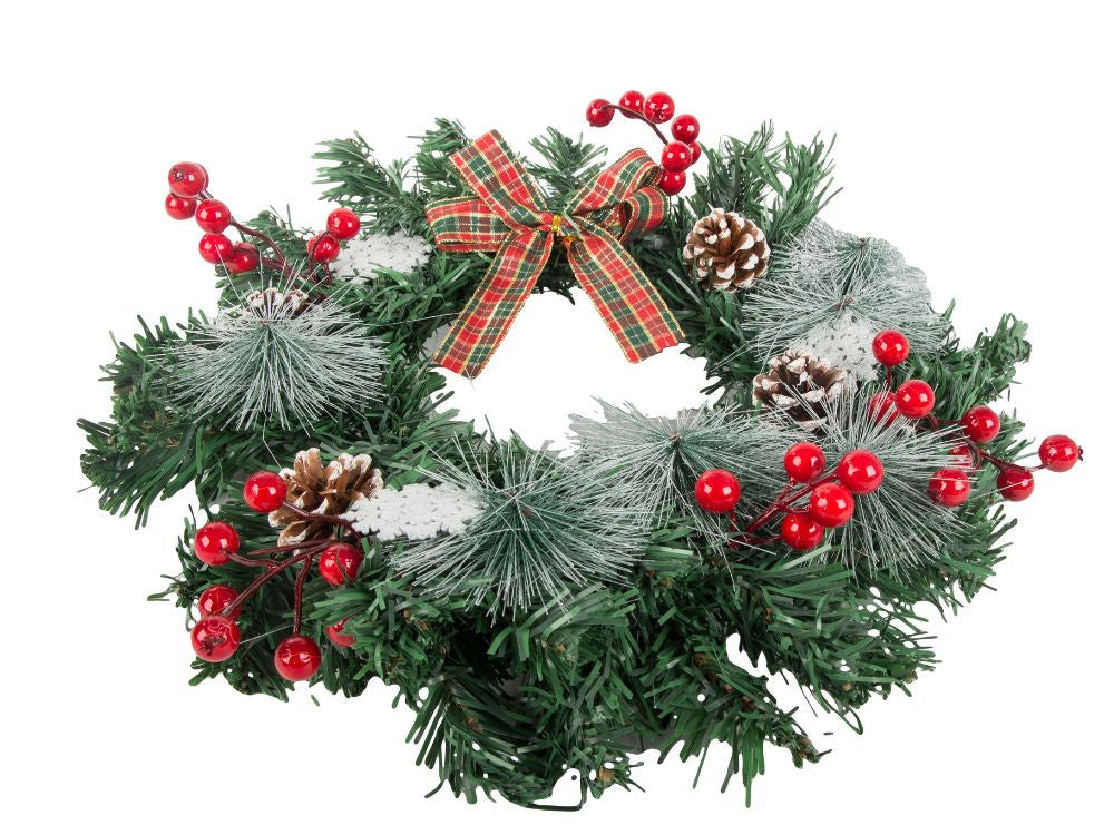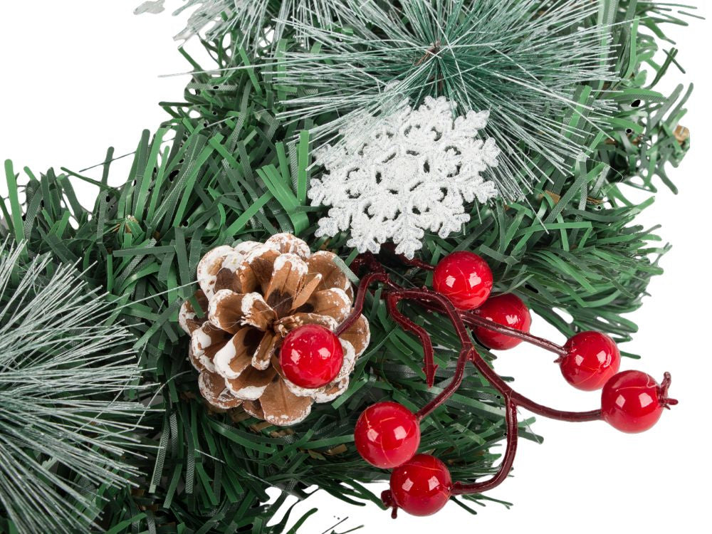 Ziemassvētku vainags sienas dekors, durvju dekors, Ziemassvētki, 30 cm. Meklējat perfektu dekoru, kas jūsu mājām piešķirs svētku sajūtu? Mūsu Ziemassvētku vainags ar rotājumiem ir unikāls aksesuārs, kas ienesīs Ziemassvētku burvību jebkurā interjerā. Iedvesma, kā skaisti izkārtot Ziemassvētku vainagu ar rotājumiem jūsu mājās:? ieejas durvis - klasiska vieta Ziemassvētku vainagam ir ieejas durvis - tas rada svētku noskaņu jau no sliekšņa. To var pakārt pie sarkanas, zelta vai sudraba krāsas lentes, saskaņojot krāsas ar pārējiem rotājumiem ārpusē. Lenti var sasiet bantītē, lai iegūtu elegantu pieskārienu.? ēdamgalda centrālais elements - novietojiet vainagu galda centrā un ievietojiet sveci vai LED laternu iekšpusē. Tas radīs atmosfērisku dekoru jūsu Ziemassvētku pusdienām vai vakariņām. Ja jums ir lielāks galds, ap vainagu varat novietot dažus mazus svečturus vai Ziemassvētku figūriņas, radot skaistu kompozīciju.? kamīna dzega vai plaukts - pakariet vainagu virs kamīna dzegas vai plauktā kā centrālu dekoratīvu elementu viesistabā. Vainags lieliski saderēs ar citiem rotājumiem, piemēram, egļu zariem, svecēm, mini rotājumiem vai lampiņām.? Logs — vainags, kas pakārts logā, rada svētku atmosfēru gan mājā, gan ārpus tās. Varat pievienot nelielas LED lampiņas, lai vakarā radītu maģisku apgaismojumu, kas redzams no ārpuses. ? Kāpnes — vainagu var pakārt gar margām, lai piešķirtu kāpnēm šarmu. Varat izvietot vainagus ik pēc dažiem pakāpieniem un starp tiem izvietot egļu zarus vai pievienot lampiņas, lai viesus vadītu augšup pa kāpnēm svētku atmosfērā. . Tehniskās specifikācijas: ? Simbols: ? Ziemassvētku detaļas ? Ideāls rotājums mājas iekšpusei un ārpusei ? Dabīgi čiekuri ? Viegla konstrukcija ? Ziemassvētku dizains ? Vainaga diametrs: Komplektā ietilpst: ? Ziemassvētku vainags ar rotājumiem ? Folijas iepakojums
