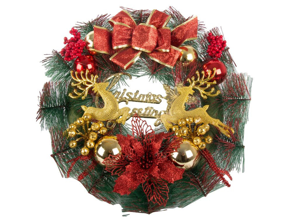 Ziemassvētku vainags sienas dekors, durvju dekors, Ziemassvētki, 30 cm. Meklējat perfektu dekoru, kas jūsu mājām piešķirs svētku sajūtu? Mūsu Ziemassvētku vainags ar rotājumiem ir unikāls aksesuārs, kas ienesīs Ziemassvētku burvību jebkurā interjerā. Iedvesma, kā skaisti izkārtot Ziemassvētku vainagu ar rotājumiem jūsu mājās:? ieejas durvis - klasiska vieta Ziemassvētku vainagam ir ieejas durvis - tas rada svētku noskaņu jau no sliekšņa. To var pakārt pie sarkanas, zelta vai sudraba krāsas lentes, saskaņojot krāsas ar pārējiem rotājumiem ārpusē. Lenti var sasiet bantītē, lai iegūtu elegantu pieskārienu.? ēdamgalda centrālais elements - novietojiet vainagu galda centrā un ievietojiet sveci vai LED laternu iekšpusē. Tas radīs atmosfērisku dekoru jūsu Ziemassvētku pusdienām vai vakariņām. Ja jums ir lielāks galds, ap vainagu varat novietot dažus mazus svečturus vai Ziemassvētku figūriņas, radot skaistu kompozīciju.? kamīna dzega vai plaukts - pakariet vainagu virs kamīna dzegas vai plauktā kā centrālu dekoratīvu elementu viesistabā. Vainags lieliski saderēs ar citiem rotājumiem, piemēram, egļu zariem, svecēm, mini rotājumiem vai lampiņām.? Logs — vainags, kas pakārts logā, rada svētku atmosfēru gan mājā, gan ārpus tās. Varat pievienot nelielas LED lampiņas, lai vakarā radītu maģisku apgaismojumu, kas redzams no ārpuses. ? Kāpnes — vainagu var pakārt gar margām, lai piešķirtu kāpnēm šarmu. Varat izvietot vainagus ik pēc dažiem pakāpieniem un starp tiem izvietot egļu zarus vai pievienot lampiņas, lai pavadītu viesus augšup pa kāpnēm svētku atmosfērā. . Vainags ir izgatavots no augstas kvalitātes priežu zariem (mākslīgiem, reālistiskiem), dekorēts ar rotājumiem, mākslīgiem ziediem, ziemeļbriežiem un lielu Ziemassvētku apsveikuma zīmi. Tradicionālās Ziemassvētku krāsas. Virtene ir ļoti bagātīgi dekorēta. Tehniskās specifikācijas: ? Simbols: ? Ziemassvētku detaļas ? Ideāls rotājums mājas iekšpusei un ārpusei ? Dabīgi čiekuri ? Viegla konstrukcija ? Ziemassvētku dizains ? Vainaga diametrs: Komplektā ietilpst: ? Ziemassvētku vainags ar rotājumiem ? Folijas iepakojums
