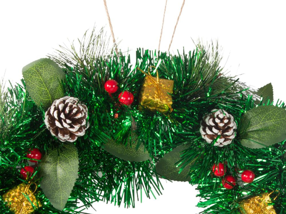 Vainags Ziemassvētku vainags Ziemassvētku durvju dekors logu dekors Meklējat perfektu dekoru, kas jūsu mājām piešķirs svētku sajūtu? Mūsu Ziemassvētku vainags ar rotājumiem ir unikāls aksesuārs, kas ienesīs Ziemassvētku burvību jebkurā interjerā. Iedvesma, kā skaisti izkārtot Ziemassvētku vainagu ar rotājumiem jūsu mājās: ? ieejas durvis - klasiska vieta Ziemassvētku vainagam ir ieejas durvis - tas rada svētku noskaņu jau no sliekšņa. To var pakārt pie sarkanas, zelta vai sudraba krāsas lentes, saskaņojot krāsas ar pārējiem rotājumiem ārpusē. Lenti var sasiet bantītē, lai iegūtu elegantu pieskārienu. ? ēdamgalda centrālais elements - novietojiet vainagu galda centrā un ievietojiet sveci vai LED laternu iekšpusē. Tas radīs atmosfērisku dekoru jūsu Ziemassvētku pusdienām vai vakariņām. Ja jums ir lielāks galds, ap vainagu varat novietot dažus mazus svečturus vai Ziemassvētku figūriņas, radot skaistu kompozīciju. ? kamīna dzega vai plaukts - pakariet vainagu virs kamīna dzegas vai plauktā kā centrālu dekoratīvu elementu viesistabā. Vainags lieliski saderēs ar citiem rotājumiem, piemēram, egļu zariem, svecēm, mini rotājumiem vai lampiņām. ? Logs — logā iekārts vainags rada svētku atmosfēru gan mājā, gan ārpus tās. Varat pievienot nelielas LED lampiņas, lai vakarā radītu maģisku apgaismojumu, kas redzams no ārpuses. ? Kāpnes — gar margām var pakārt vainagu, lai kāpnēm piešķirtu šarmu. Varat izvietot vainagus ik pēc dažiem pakāpieniem un starp tiem izvietot egļu zarus vai pievienot lampiņas, lai viesus vadītu augšup pa kāpnēm svētku atmosfērā. . Tehniskās specifikācijas: ? Simbols: ? Ziemassvētku raksti un detaļas ? Ideāls rotājums mājas iekšpusei un ārpusei ? Dabīgi čiekuri ? Viegla konstrukcija ? Ziemassvētku dizains ? Vainaga diametrs: Komplektā ietilpst: ? Ziemassvētku vainags ar rotājumiem ? Folijas iepakojums