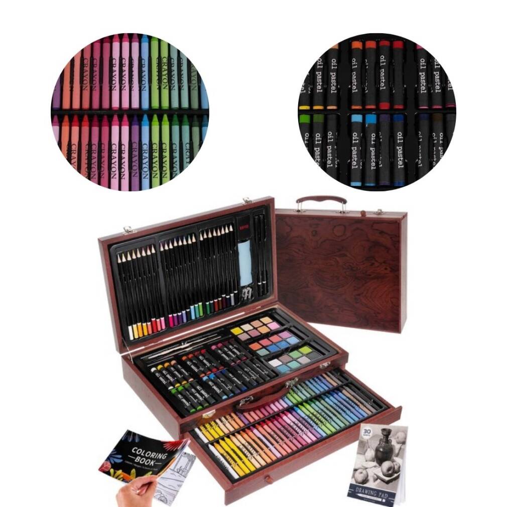 Glezniecības komplekts ir ērtā koka koferī. To var aizslēgt, un tam ir rokturis